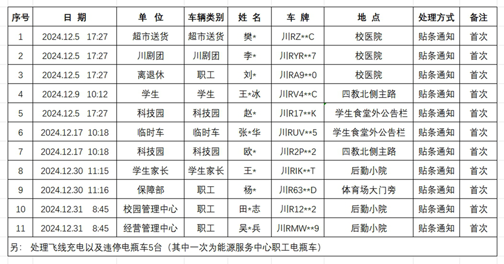 2024年12月校園內機動車違規停放名單