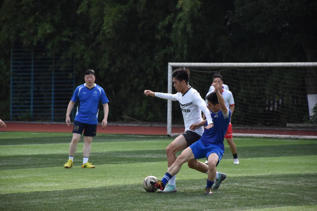 隨著一聲哨響,校區教工聯隊和各學院畢業生組成的聯隊,展開了激烈比拼。雙方配合默契,展示出不俗的實力,不斷打出精妙的配合和有威脅性的進攻,博得現場觀眾陣陣喝彩。開場不到10分鐘,畢業生聯隊同學一個完美的盤帶傳球,率先破門獲得1分。教工聯隊奮起追趕,憑借著豐富的經驗、優秀的個人能力,果斷變換陣形,傳球干擾學生聯隊,一記精彩的遠射扳平比分,再次點燃了全場激情。賽場上,雙方隊員精湛的腳法、完美的盤帶、犀利的射門以及精彩的配合,讓現場觀眾應接不暇。