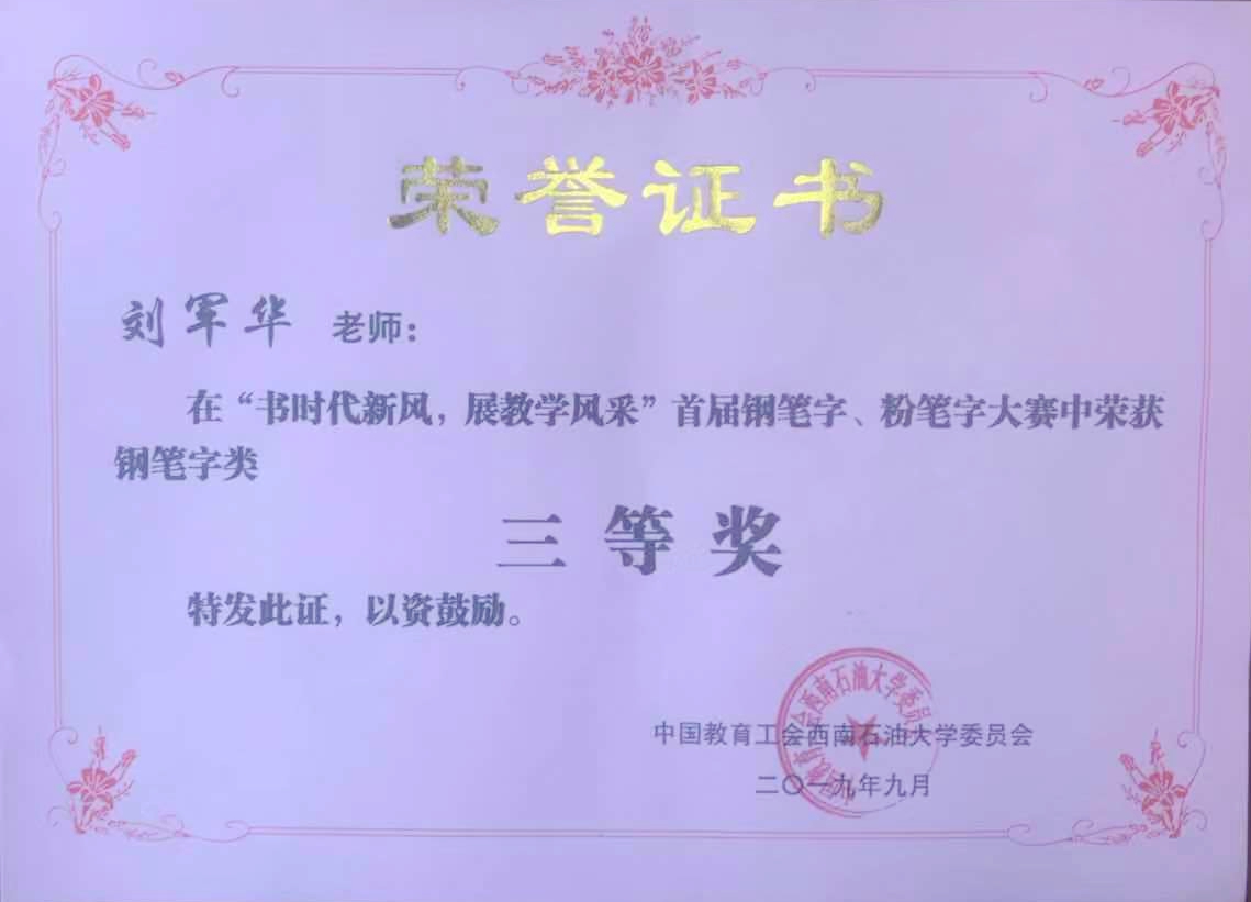 近日,學校工會舉辦了“書時代新風,展教學風采”首屆教職工鋼筆字、粉筆字大賽,南充校區(qū)李華鋒老師榮獲教職工粉筆字比賽一等獎,黃自力老師榮獲教職工粉筆字比賽三等獎,劉軍華、游東潘老師榮獲教職工鋼筆字比賽三等獎。