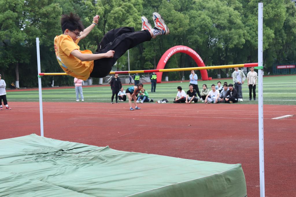 運動健兒們沖到橫桿下,左腿一蹬,右腿一抬,身子像飛燕一樣騰空而起,向上躍去,連貫又干凈利落,順利越過橫桿
