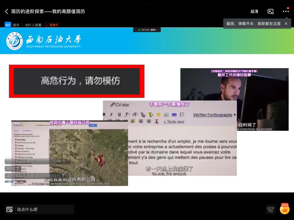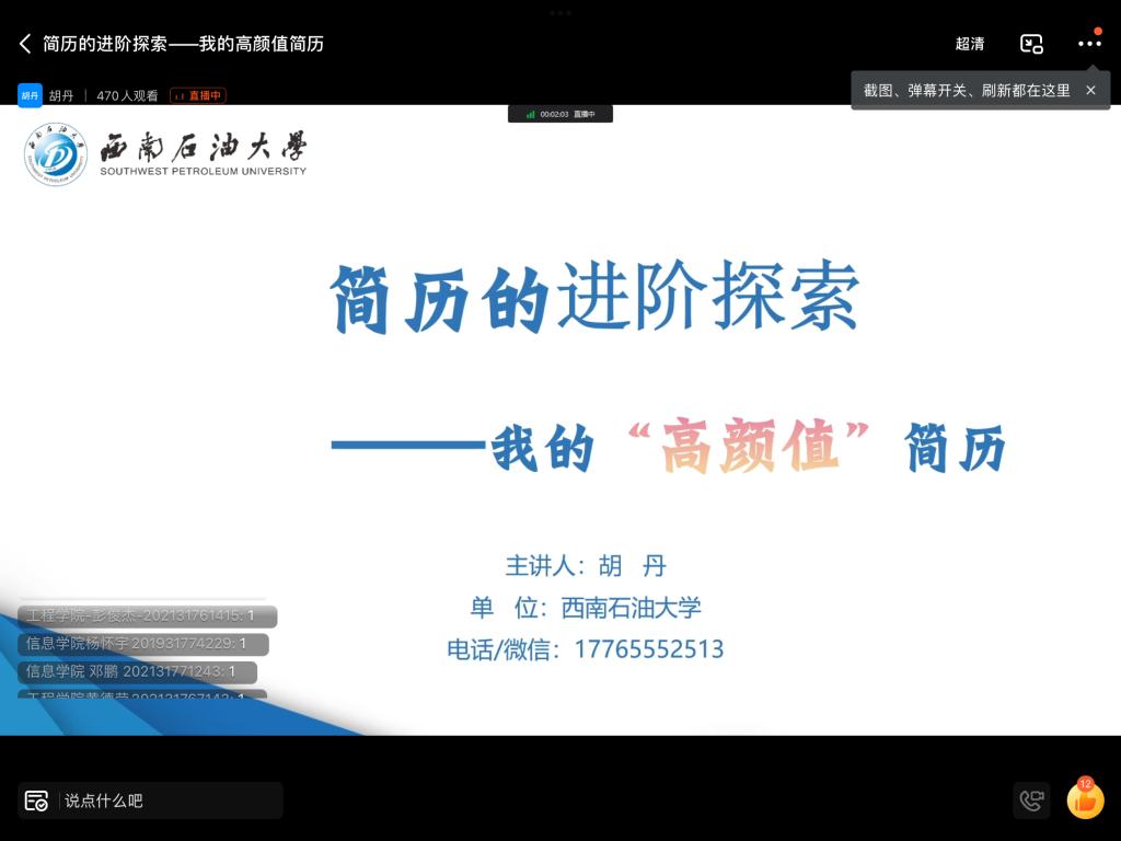 為幫助校區學子做好就業準備,進一步提升學生就業質量,6月24日晚7:00,西南石油大學南充校區通過釘釘直播平臺開展了“簡歷的進階探索——我的‘高顏值’簡歷”專題講座。本次講座邀請了西南石油大學高級輔導員、全國職業核心能力(CVCC)講師、高校就業指導師(TTT-2)胡丹擔任主講。校區近一千名學子在線觀看了直播。