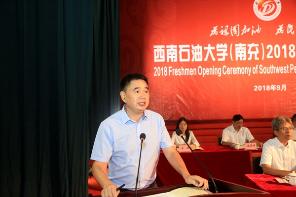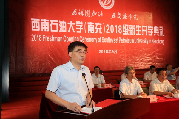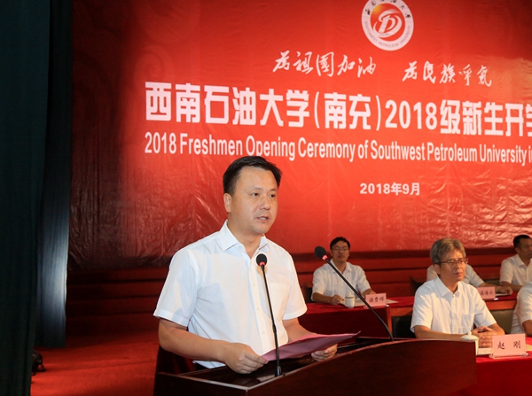 吳群剛在典禮上講了話。他代表南充市委、市政府對2018級同學表示祝賀和歡迎。他說,西南石油大學優勢突出、特色鮮明、實力強勁,已成功入選國家首批“雙一流”建設高校。南充擁有2200年建城史,是四川省人口大市和經濟大市,當前全市上下正全面落實省委十一屆三次全會決策部署,全力建設“成渝第二城”、爭創全省經濟副中心,必將為同學們的學習、生活創造更加美好優良的環境支撐。