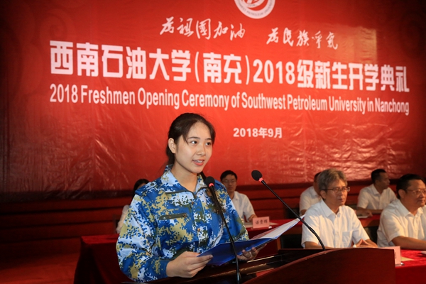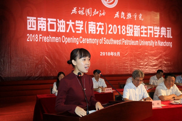 數字媒體技術專業2018級唐曉倩代表全體新生發言,表示將在西南石大的這片沃土,獨立自強,學有所成。祝愿西南石大生日快樂,家鄉南充越來越好。