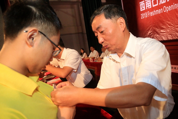 中共南充市委副書記、市長吳群剛為新生佩戴校徽