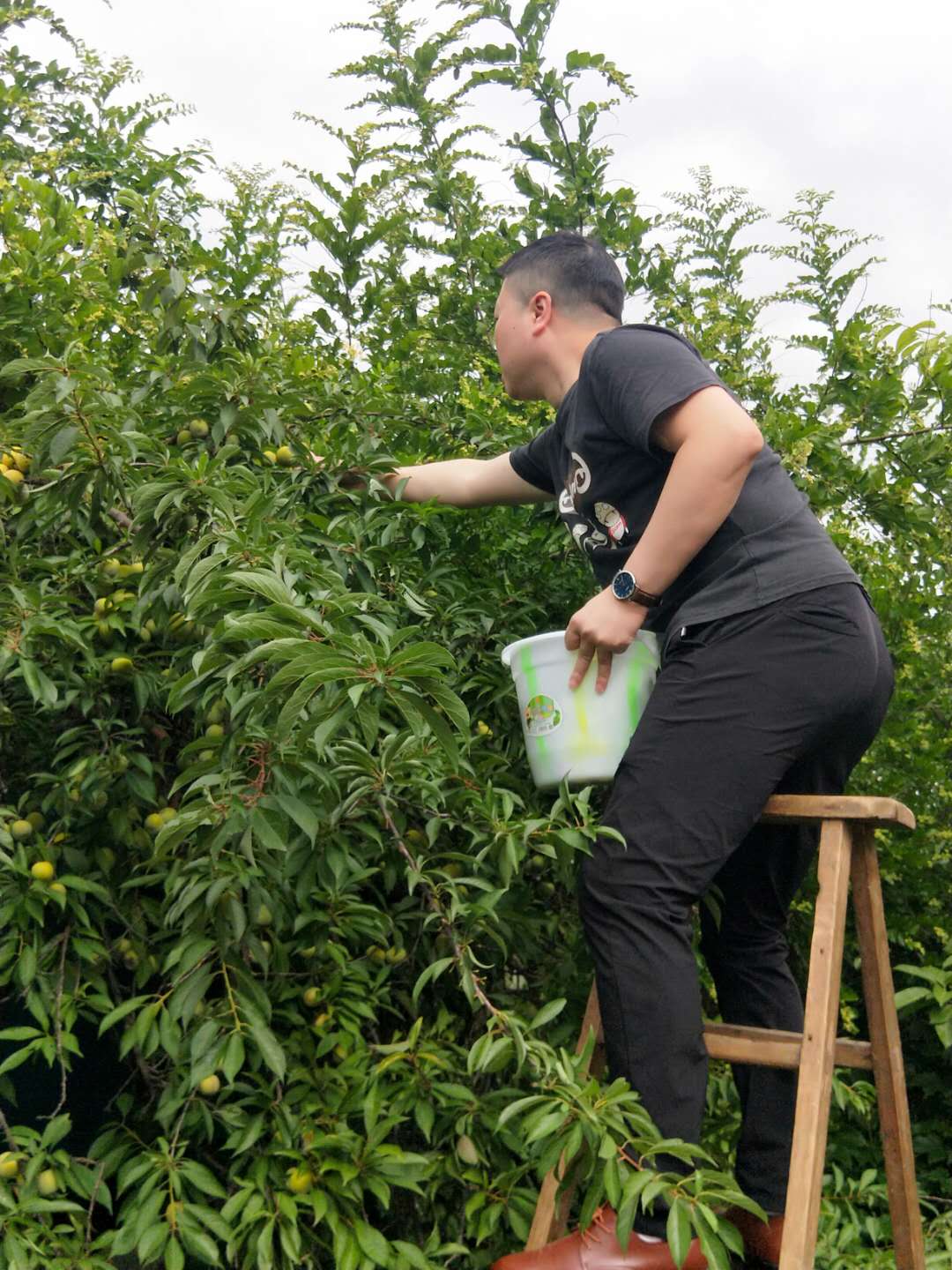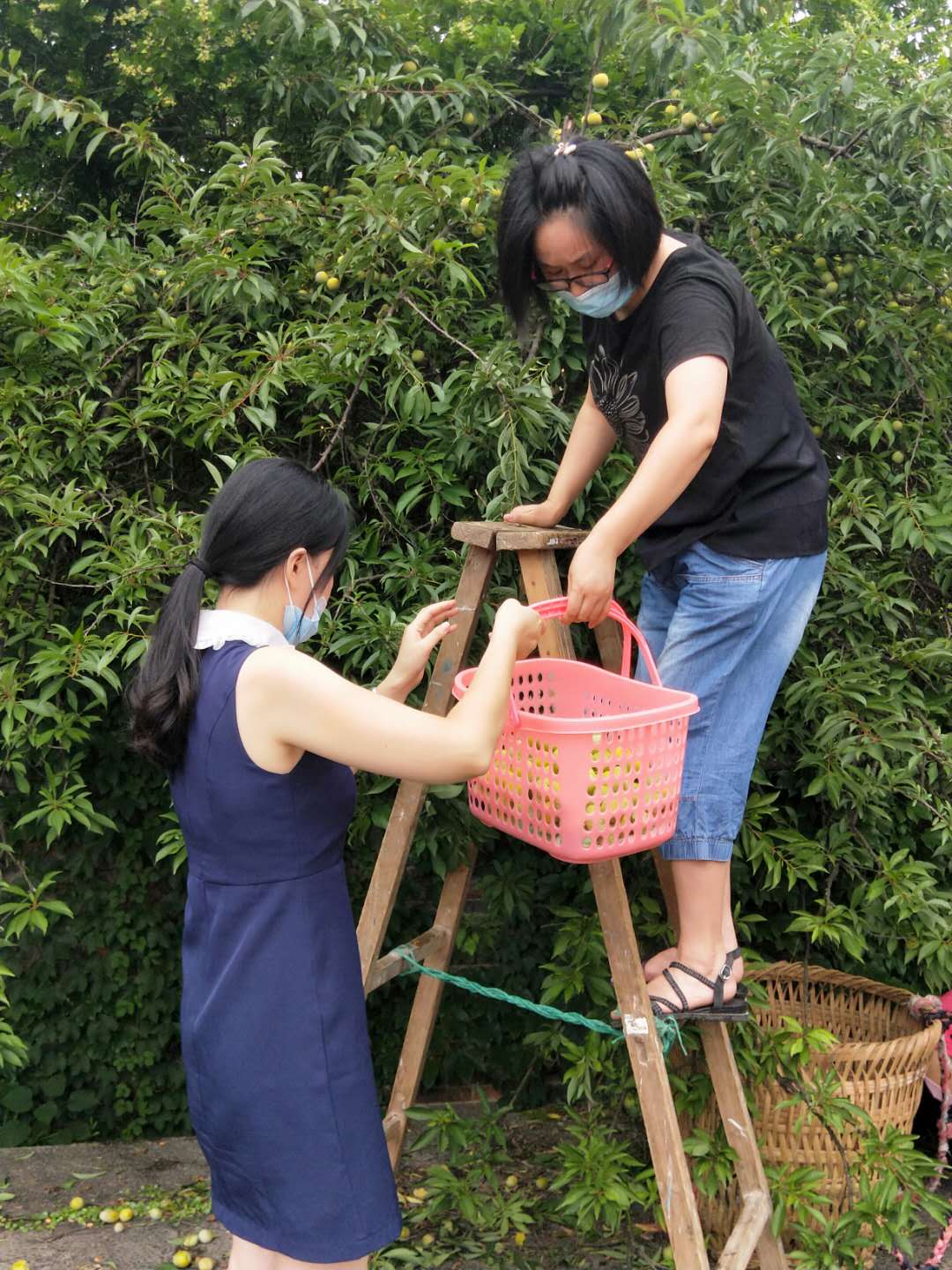 老師們或獨上枝頭,或三五成群,互幫互助忙碌在李園中,個個興致盎然。滿樹的李子在陽光的照射下,閃著嫵媚的光澤,一個個李子上覆著薄薄的一層果霜,鮮嫩圓潤。大家手里摘著這個,眼里看著那個,嘴角眉稍間都洋溢著豐收的喜悅。
