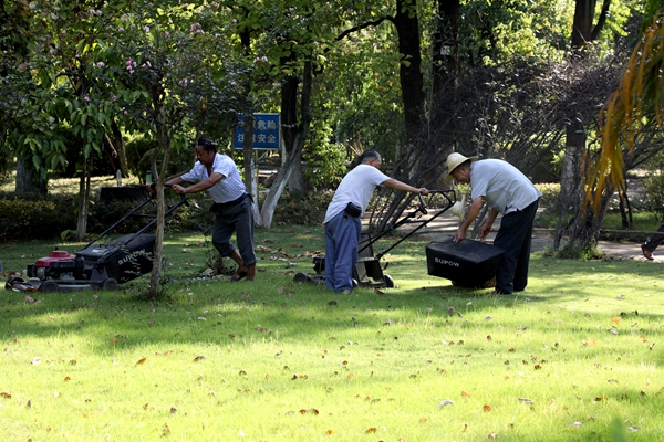 綠化環衛工人精心修剪草坪