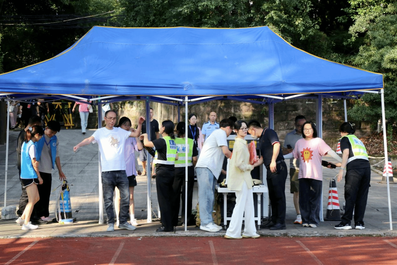 校園里,彩旗隨風飄揚,志愿者在十字路口熱情為參會考生及家長指引路線。會場入口,設置了自動安檢機,全力保障參會人員的安全。