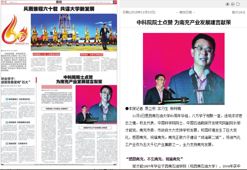11月3日,南充日報以《中科院院士點贊 為南充產業發展建言獻策》為題,獨家專訪報道了我校杰出校友、中國科學院院士鄒才能。