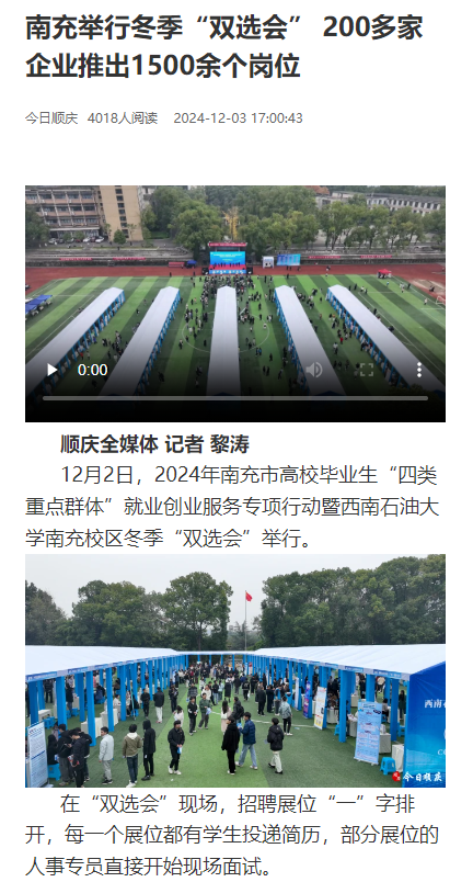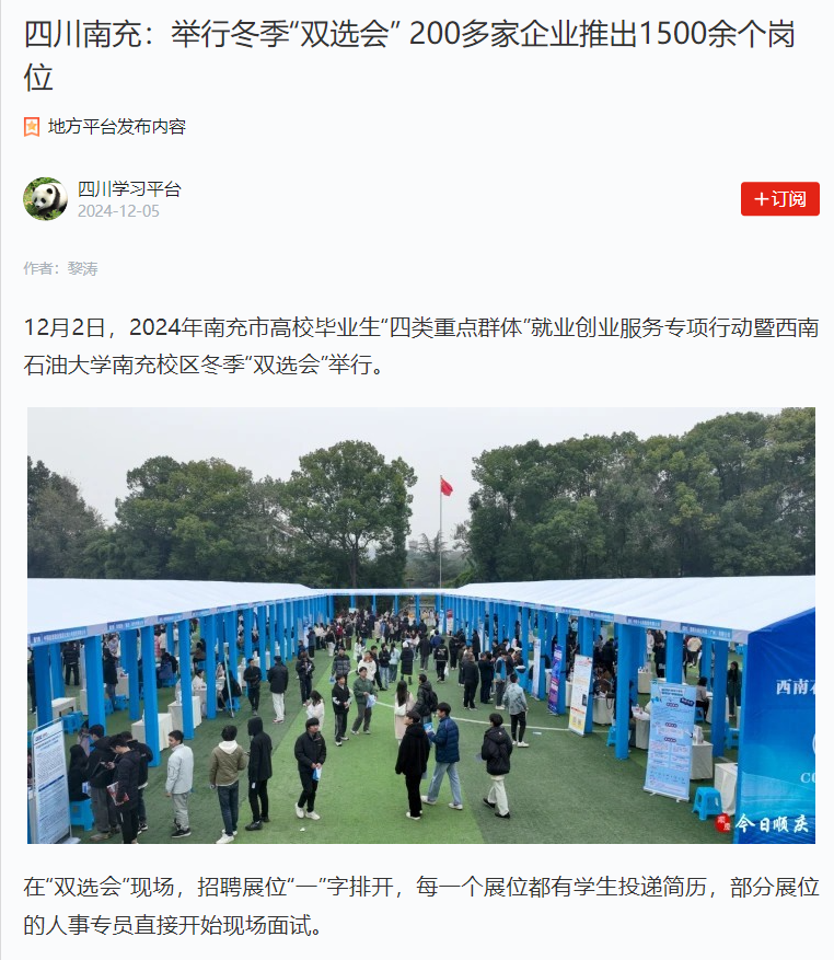 12月2日,人民網(wǎng)以《四川南充:冬季專(zhuān)場(chǎng)招聘會(huì)助大學(xué)生就業(yè)》為題進(jìn)行了相關(guān)報(bào)道。12月3日,今日順慶以《南充舉行冬季“雙選會(huì)”200多家企業(yè)推出1 500余個(gè)崗位》為題進(jìn)行了相關(guān)報(bào)道。12月5日,學(xué)習(xí)強(qiáng)國(guó)以《四川南充:舉行冬季“雙選會(huì)”200多家企業(yè)推出1500余個(gè)崗位》為題進(jìn)行了相關(guān)報(bào)道。