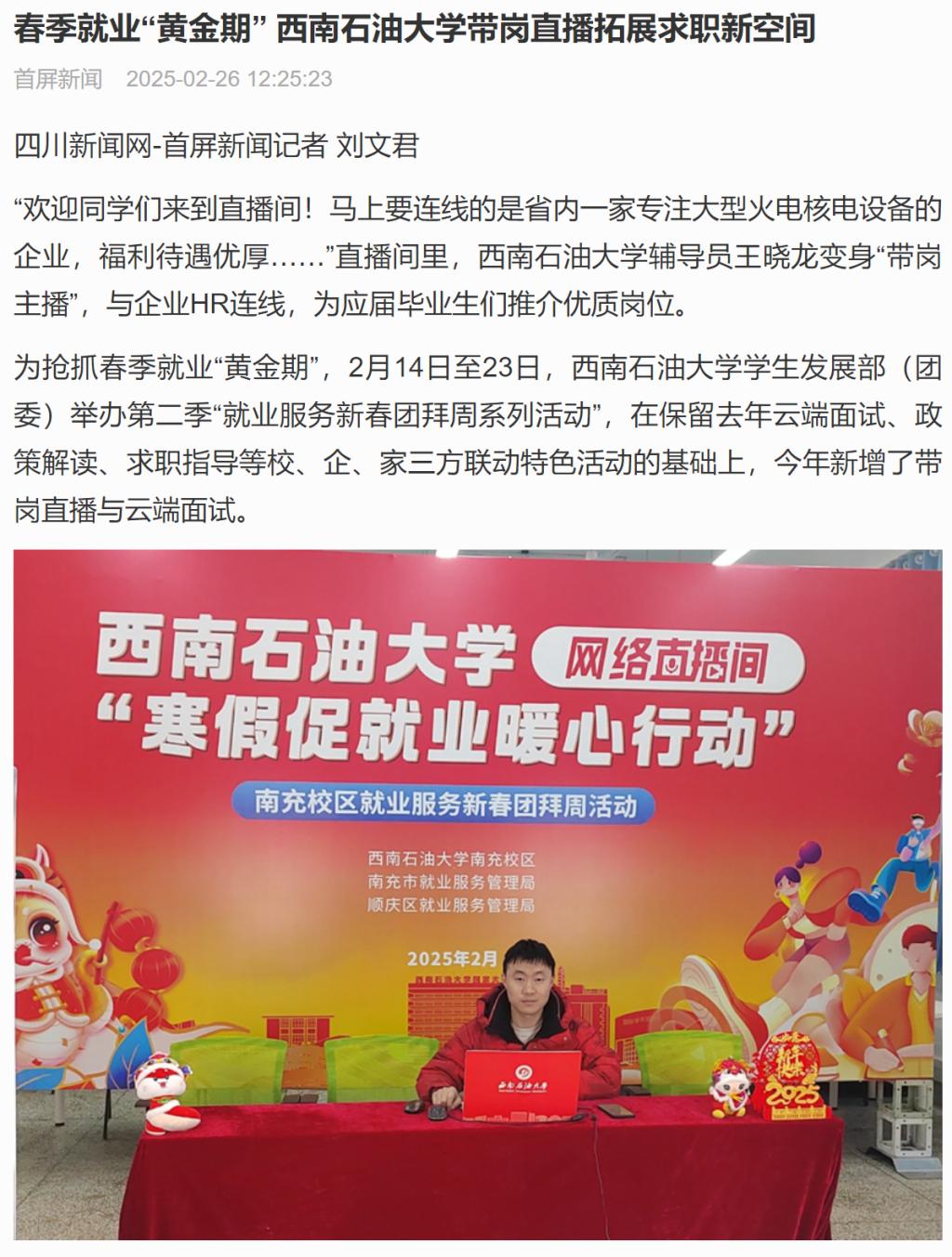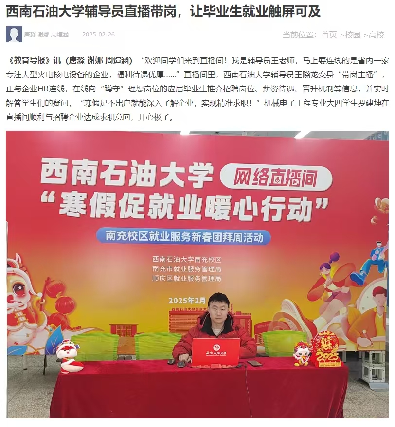 2月26日,四川新聞網(wǎng)、首屏新聞以《春季就業(yè)“黃金期”西南石油大學(xué)帶崗直播拓展求職新空間》為題進(jìn)行了相關(guān)報(bào)道,2月26日,教育導(dǎo)報(bào)網(wǎng)以《西南石油大學(xué)輔導(dǎo)員直播帶崗,讓畢業(yè)生就業(yè)觸屏可及》為題進(jìn)行了相關(guān)報(bào)道。