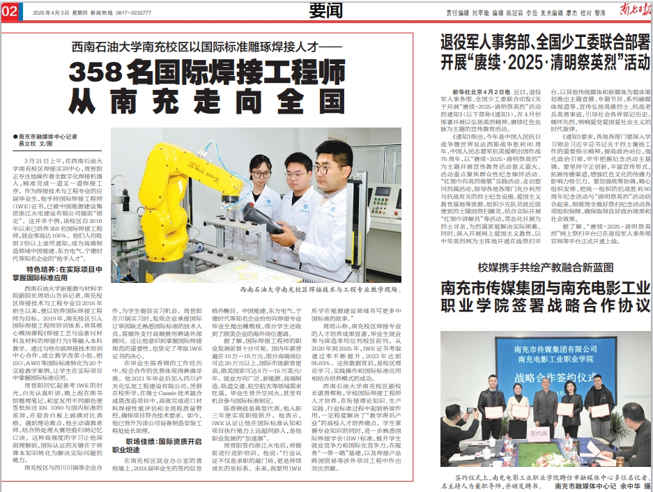 3月31日上午,在南充校區焊接實訓中心,周晉陽正專注地操作著全數字化焊接機器人,精準完成一道又一道焊接工序。作為焊接技術與工程專業的應屆畢業生,他手持國際焊接工程師(IWE)證書,已被中國能源建設集團浙江火電建設有限公司提前“鎖定”。這并非個例,該校區自2016年以來已培養358名國際焊接工程師,就業率高達100%。他們人均收到3份以上錄用通知,成為高端制造領域中國能建、東方電氣、寧德時代等知名企業的“搶手人才”。