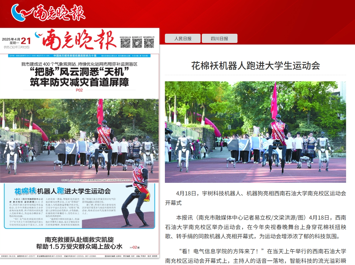 4月18日至19日,西南石油大學(xué)南充校區(qū)以“體育鑄魂·文化賦能”為底色,奏響春季田徑運(yùn)動會的激昂樂章。在西南石油大學(xué)南充校區(qū)的綠茵場上,春晚舞臺上的“明星”——宇樹科技機(jī)器人化身“科技使者”,與川劇變臉、英歌舞等傳統(tǒng)藝術(shù)交相輝映,共同勾勒出一幅“傳統(tǒng)與現(xiàn)代對話、體育與文化共生”的青春畫卷。