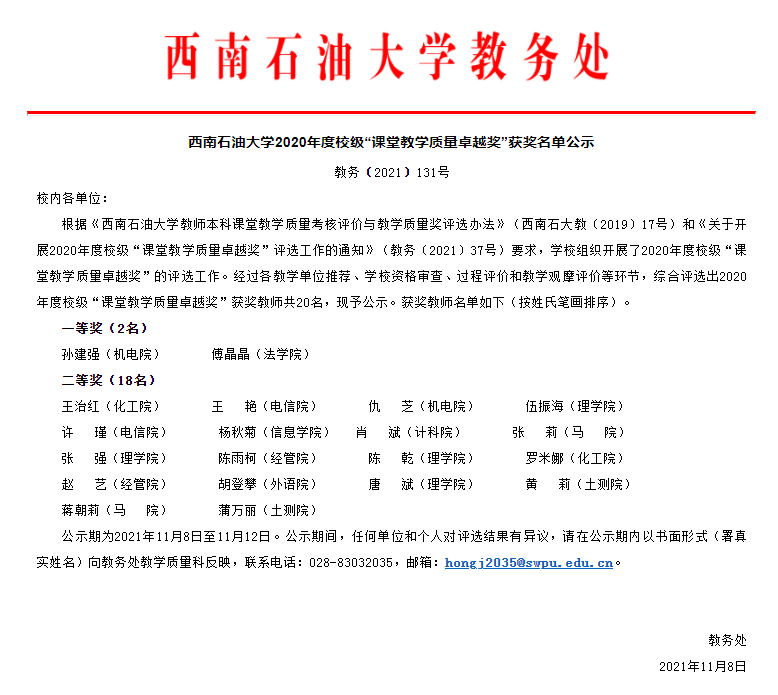 近日,學校舉行2020年度“課堂教學質量卓越獎”教學觀摩評價活動,26名來自各學院的教師登上講臺,展示課堂教學風采。信息學院楊秋菊老師榮獲西南石油大學2020年度校級“課堂教學質量卓越獎”二等獎。本次評選出2020年度校級“課堂教學質量卓越獎”獲獎教師共20名。