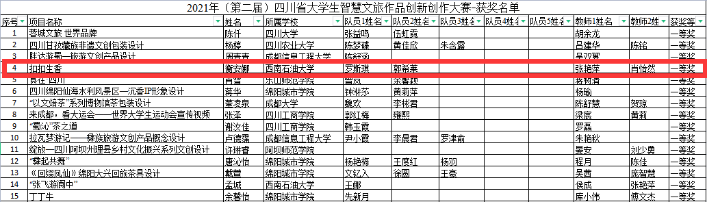 獲獎公示鏈接:關于2021年(第二屆)四川省大學生智慧文旅作品創(chuàng)新創(chuàng)作大賽獲獎公示-四川省本科高校學科競賽平臺 (ycfuture.cn)