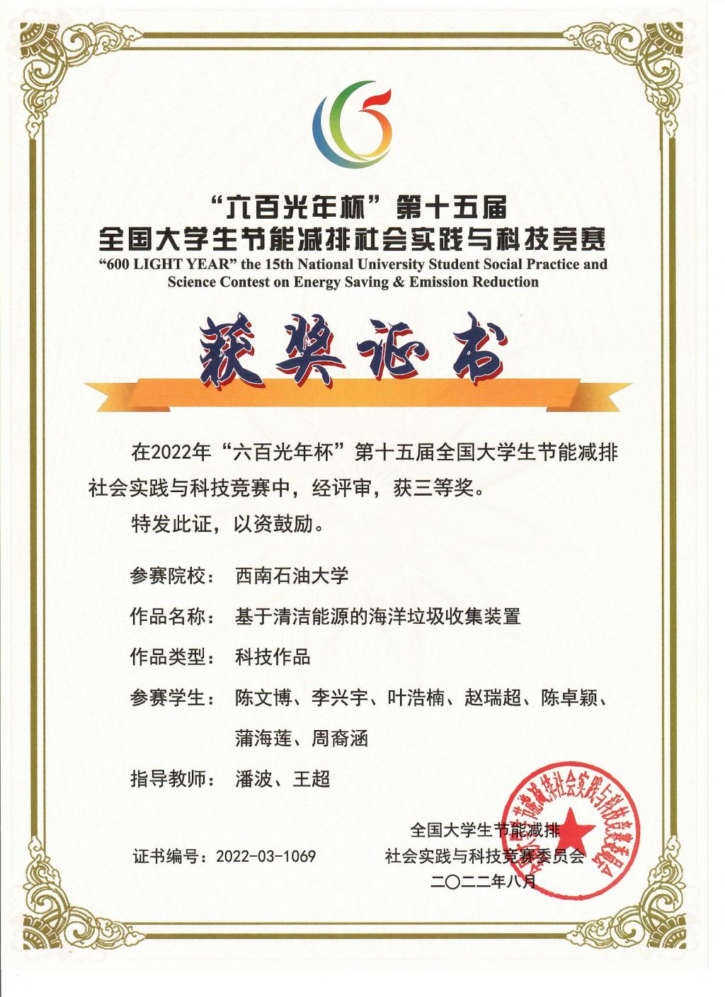 參賽作品《基于清潔能源的海洋垃圾收集裝置》榮獲科技作品類全國三等獎