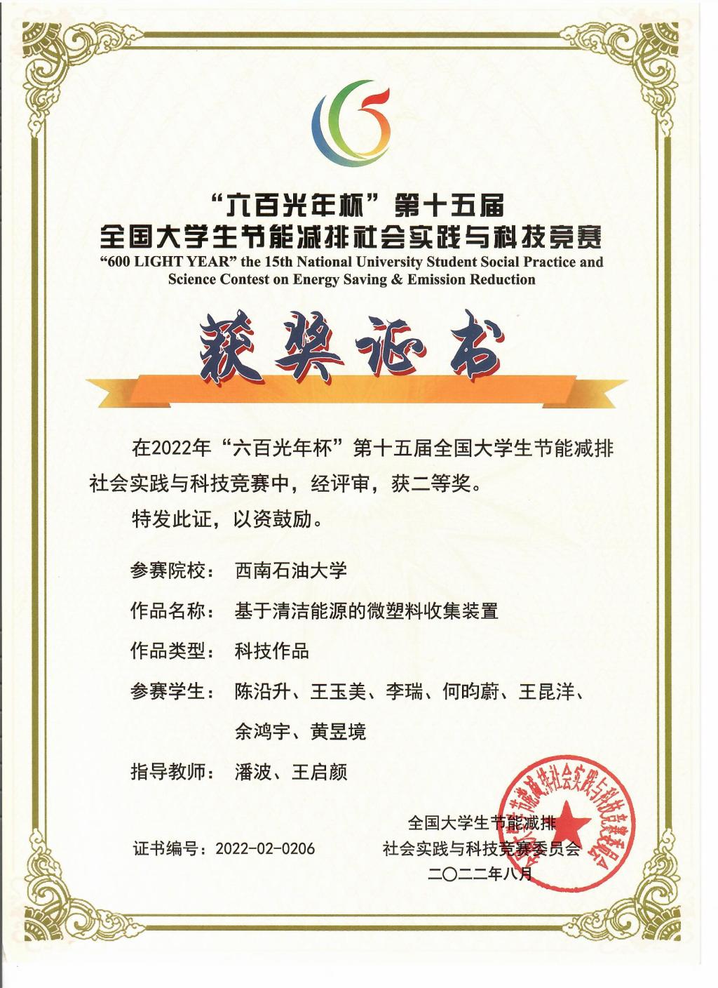 參賽作品《基于清潔能源的微塑料收集裝置》榮獲科技作品類全國二等獎
