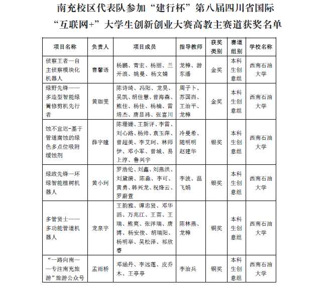 8月26日,“建行杯”第八屆四川省國際“互聯(lián)網(wǎng)+”大學(xué)生創(chuàng)新創(chuàng)業(yè)大賽獲獎名單公布,南充校區(qū)5件參賽作品分別榮獲本屆比賽高教主賽道本科生創(chuàng)意組金獎2項、銀獎2項、銅獎2項。