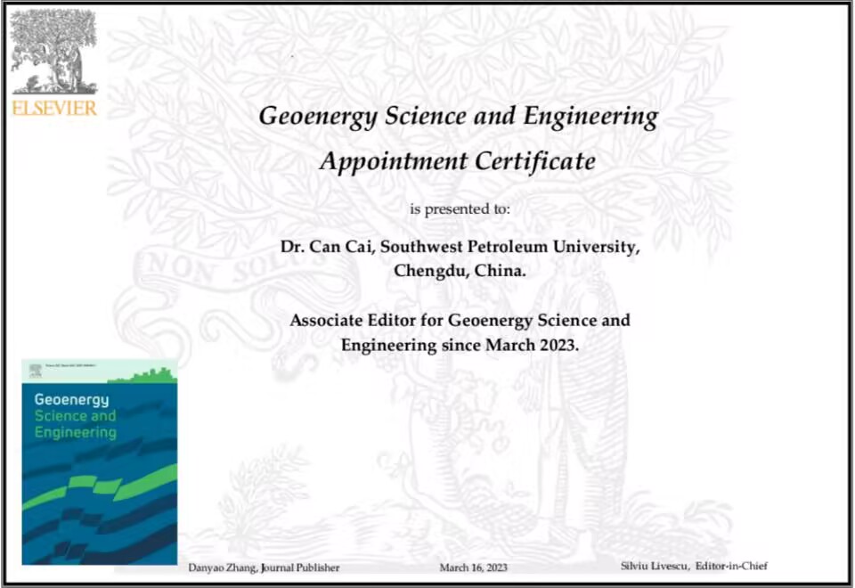 近日,國際著名學術期刊《Geoenergy Science and Engineering》(GEOEN,原Journal of Petroleum Science and Engineering,2023年改為現刊名)聘任機電工程學院青年教師蔡燦擔任副主編(Associate Editor)。