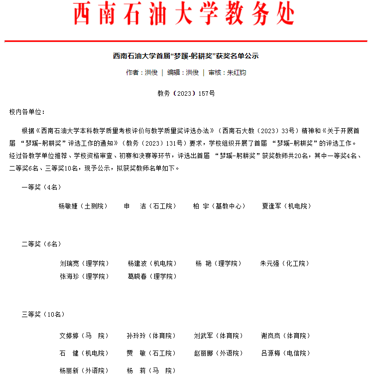 12月15日,學(xué)校首屆 “夢蹊-躬耕獎”的評選結(jié)果公布,土木工程與測繪學(xué)院楊敏捷老師、教務(wù)部文化素質(zhì)與公共基礎(chǔ)課教學(xué)中心柏宇老師榮獲一等獎。理學(xué)院張海珍老師榮獲二等獎,電氣信息學(xué)院呂源梅老師榮獲三等獎。