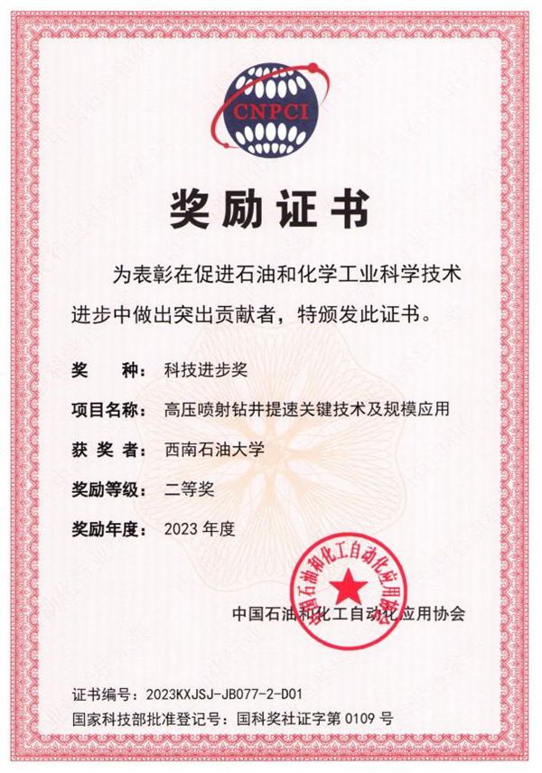 頒獎大會上,中國石油和化工自動化應用協會頒發了2023年度科學技術獎與專利獎,我校為第一完成單位、校區蔡燦為第一完成人的“高壓噴射鉆井提速關鍵技術及規模應用”項目榮獲科技進步二等獎,楊顯鵬、陳浩為項目共同完成人。