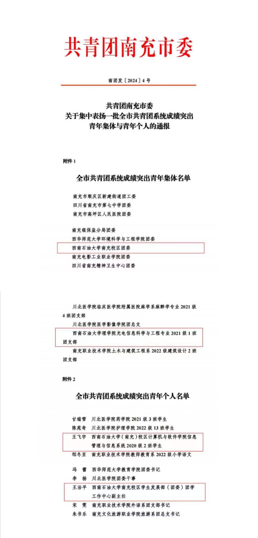 近日,共青團南充市委對全市2023年度共青團系統工作突出的青年集體和個人予以表揚,校區團委、理學院光電信息科學與工程專業2021級1班團支部均獲2023年“南充市共青團系統成績突出青年集體”榮譽稱號。學生發展部(團委)團學工作中心副主任王治平、計算機與軟件學院信息管理與信息系統專業2020級2班學生王飛宇獲“突出青年個人”榮譽稱號。