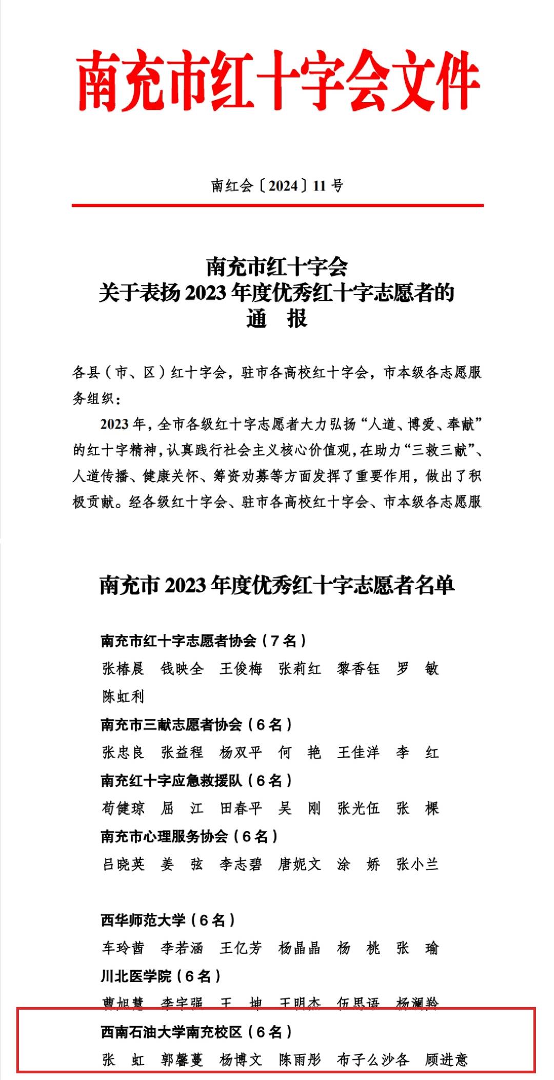 近日,南充市紅十字會對全市各級優秀紅十字志愿者予以表彰,張虹、郭馨蔓、楊博文、陳雨彤、布子么沙各、顧進意榮獲“南充市2023年度優秀紅十字志愿者”表彰。