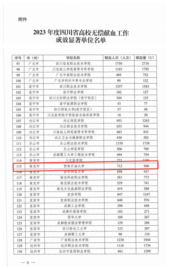 近日,四川省衛生健康委員會、省教育廳聯合印發了《關于表揚2023年度四川省高校無償獻血工作成效顯著單位的通報》,校區榮獲“2023年度四川省高校無償獻血工作成效顯著單位”稱號。