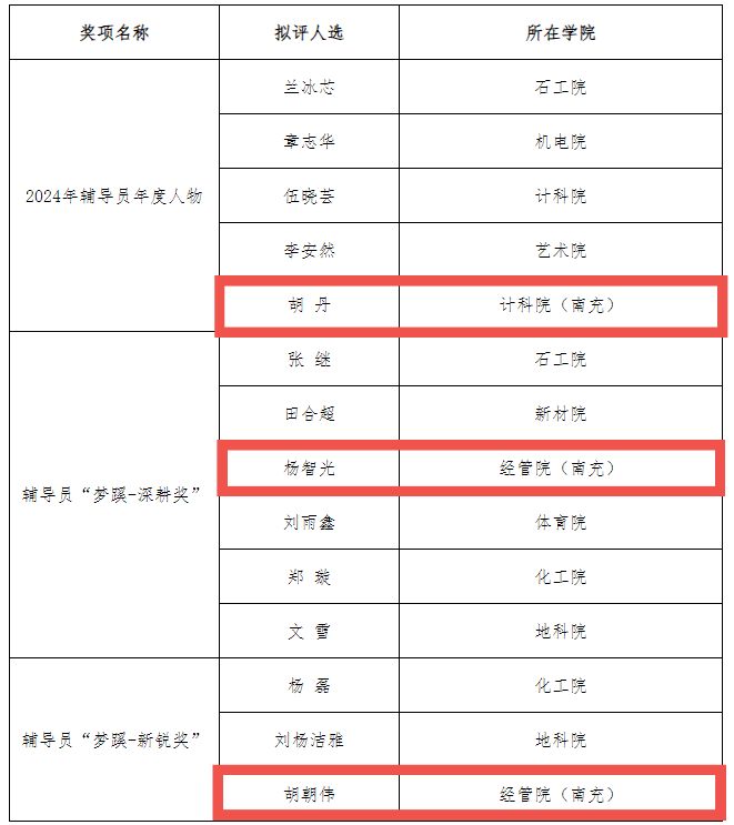為充分發揮輔導員先進的示范引領作用,切實推動輔導員隊伍建設高質量發展,近日,學校開展2024年輔導員先進個人的評選工作,計算機與軟件學院輔導員胡丹榮獲學校2024年“輔導員年度人物”,經濟管理學院輔導員楊智光榮獲“夢溪-深耕獎”,經濟管理學院輔導員胡朝偉榮獲“夢溪-新銳獎”。
