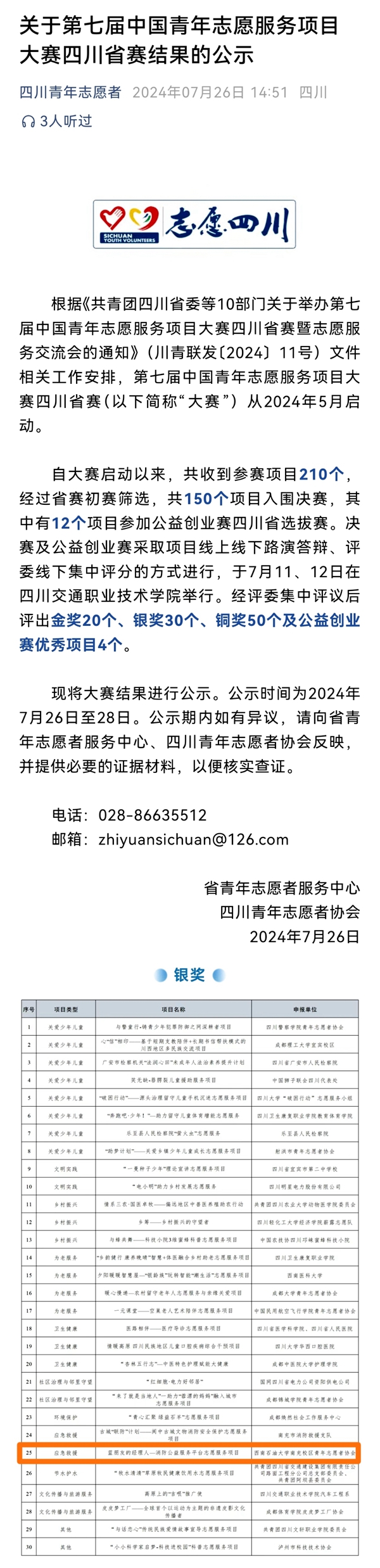 7月11日、12日,第七屆中國青年志愿服務項目大賽四川省決賽在成都市舉行。南充校區青年志愿者協會“藍朋友的經理人--消防公益服務平臺”志愿服務項目榮獲銀獎。