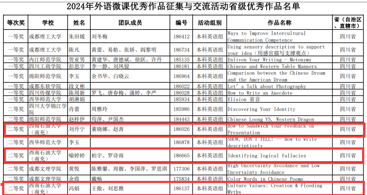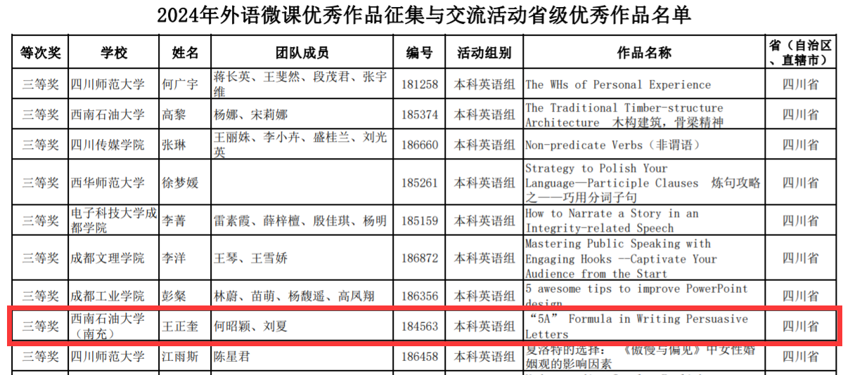 南充校區劉丹寧教師團隊、喻婷婷教師團隊、馮娟教師團隊,憑借出色的教學視頻、精彩的教學設計、豐富的教學內容,均榮獲本科英語組全省二等獎,王正奎教師團隊作品榮獲四川省三等獎。