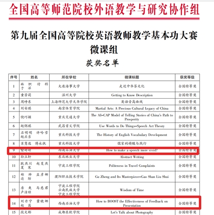 近日,第九屆全國高等院校英語教師教學(xué)基本功大賽決賽圓滿結(jié)束。教務(wù)部文化素質(zhì)與公共基礎(chǔ)課教學(xué)中心教師喻婷婷、劉丹寧均榮獲“優(yōu)秀課例評比·微課組”全國特等獎(jiǎng),王正奎榮獲全國二等獎(jiǎng);柏宇榮獲“優(yōu)秀課例評比·說課組”全國一等獎(jiǎng)、四川省特等獎(jiǎng),喻婷婷、董曉娜分別榮獲四川省一等獎(jiǎng)、二等獎(jiǎng);王正奎、馮娟、羅詩雨分別榮獲“優(yōu)秀課例評比·實(shí)錄課組”四川省一、二、三等獎(jiǎng)。