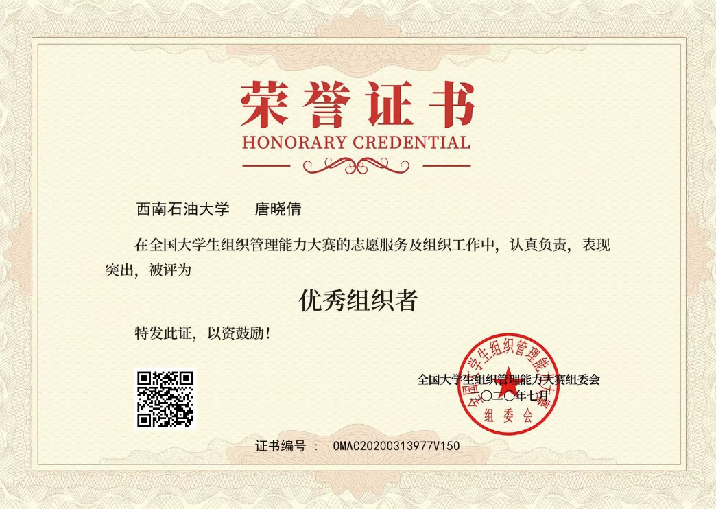 信息學院學生唐曉倩榮獲“優秀組織者”榮譽稱號