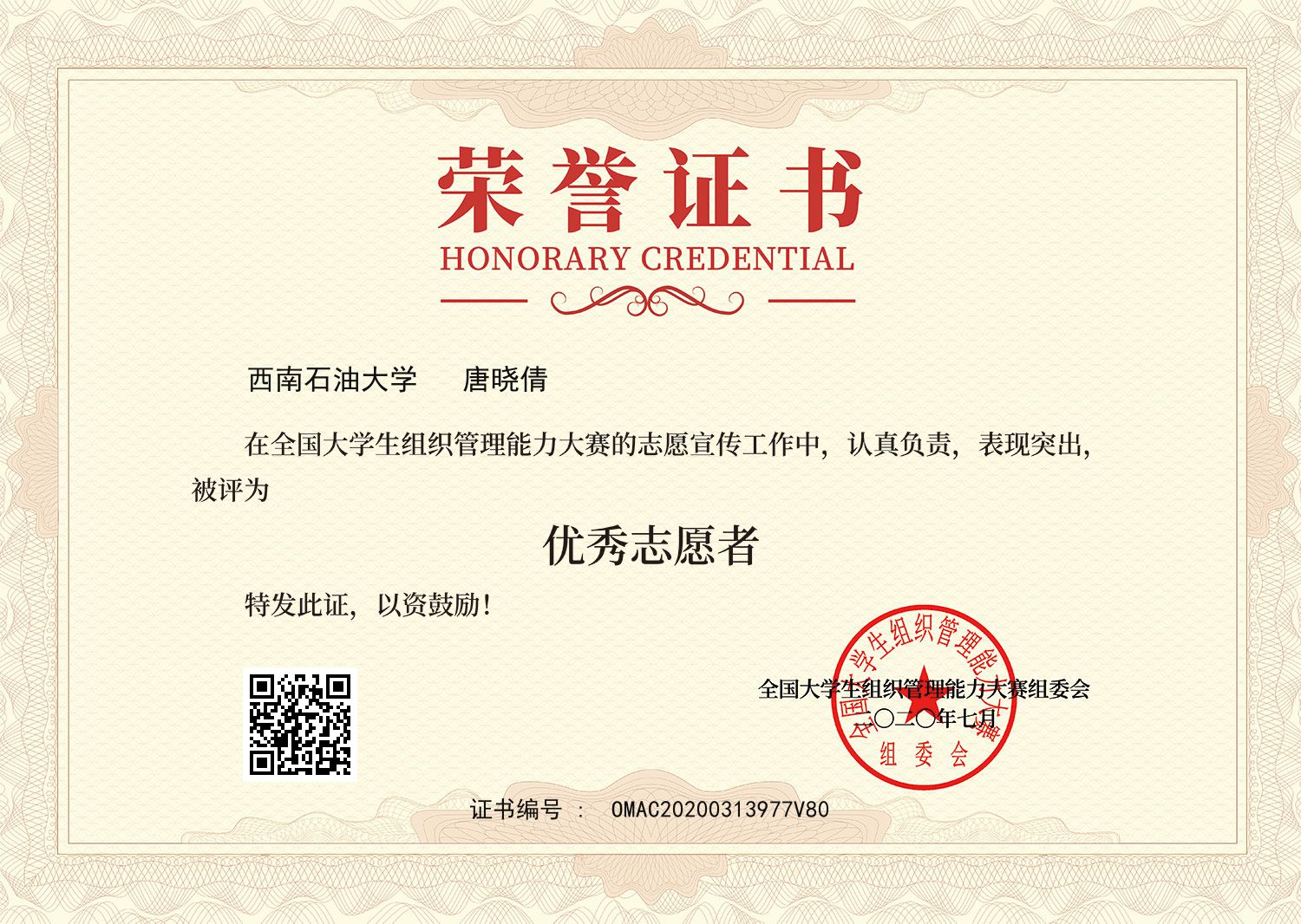 信息學院學生唐曉倩榮獲“優秀志愿者”榮譽稱號