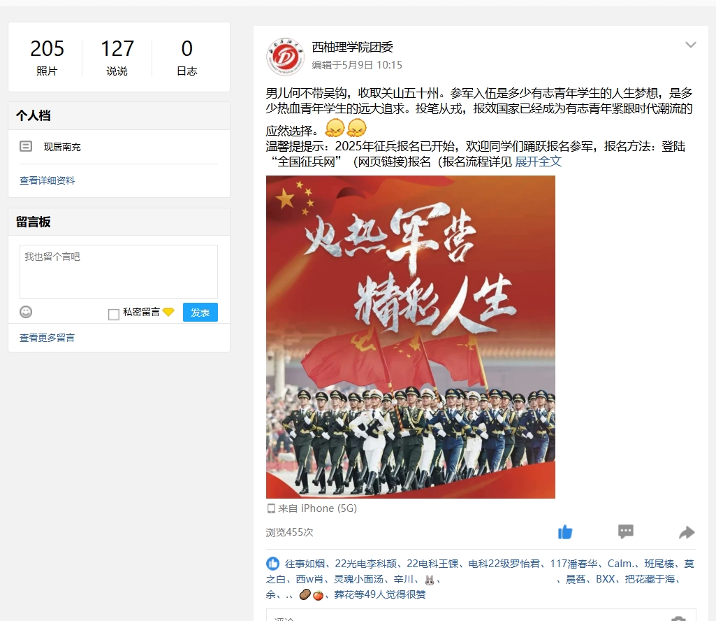 依托畢業年級QQ群、學院團學分中心官Q、易班等多平臺向全體男性畢業生定向推送應征入伍信息包,涵蓋動員信息、咨詢方式、政策圖解等內容。同時,通過黨員、班委骨干力量深入學生寢室播放應征入伍視頻,展示翻閱電子版宣講文件,確保應征男性畢業生全覆蓋,實現宣傳精準觸達。