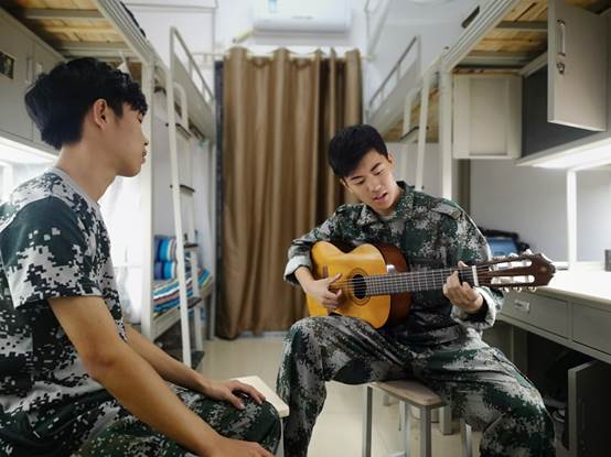 一天的軍訓生活結束,他們褪去了軍訓場上的鋒芒,回到寢室,享受他們的悠閑時光,當記者去和他們聊天時,胡樂趕忙拿出吉他,為大家獻上一曲,青春少年的活力即刻凸顯。王馨與室友談天說笑,嬉戲打鬧,微笑中透露著的是小女生的可愛。我們看到,在這個時候的他們,盡顯活力與朝氣。