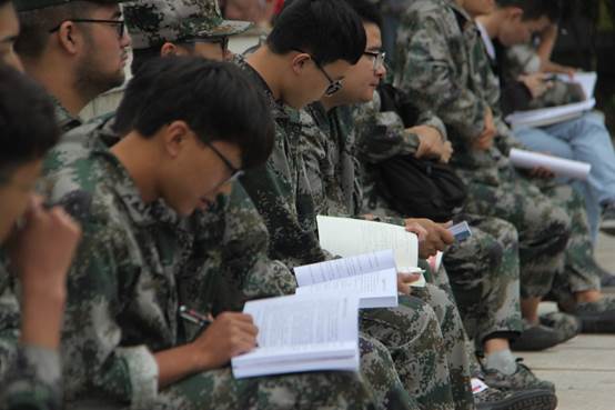 看臺上,觀訓的同學也成為了軍訓場上一道靚麗的風景線。無論烈日當頭還是陰雨綿綿,他們都整齊坐在看臺上,翻看著書本,看著其他同學們的軍訓,為他們寫著加油助威的通訊稿,激情不減。