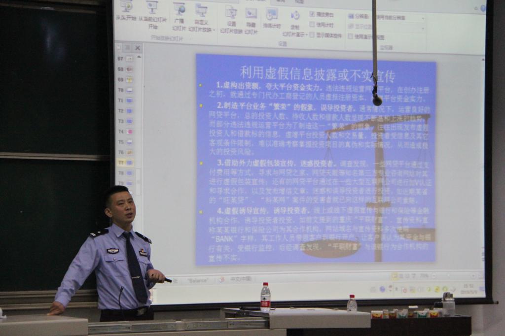 為提高同學們安全防范意識,5月9日下午,校區學生工作部(團委)、保衛部在第四教學樓4316教室舉辦了“順慶公安法治講堂進校園——大學生防范不良網貸、電信詐騙”知識講座。順慶公安分局西城派出所副所長雍彬擔任主講嘉賓,講座由校區大學生就業創業指導中心副主任唐淼主持。校區保衛部治安科科長蒲和平,順慶公安分局政治處副主任劉紅玫、經偵大隊副大隊長陽衛東等同志和200余名同學參加此次講座。