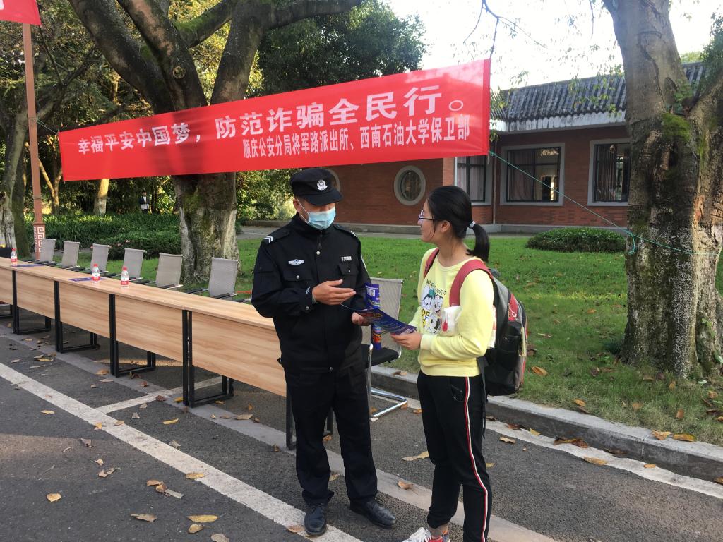 11月6日下午,保衛部聯合順慶公安分局將軍路派出所在南充校區開展了“反電信詐騙”宣傳教育活動。保衛部治安科科長蒲和平,順慶將軍路派出所派出所副所長賈曉明參加了本次活動。