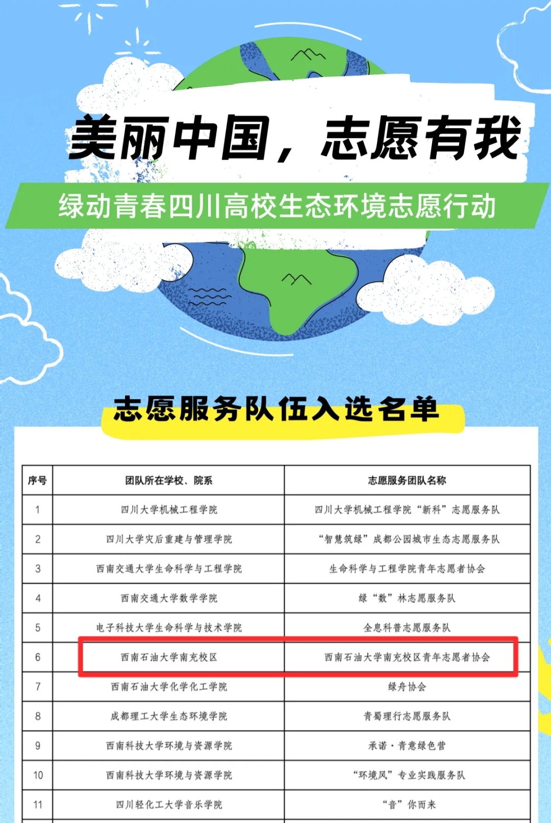 為響應團中央號召,大力推進生態環境志愿服務事業發展,引導大學生積極投身生態環境志愿服務,近日,校區青年志愿者協會成功申報并開展“美麗中國,志愿有我”——綠動青春四川高校生態環境志愿行動。