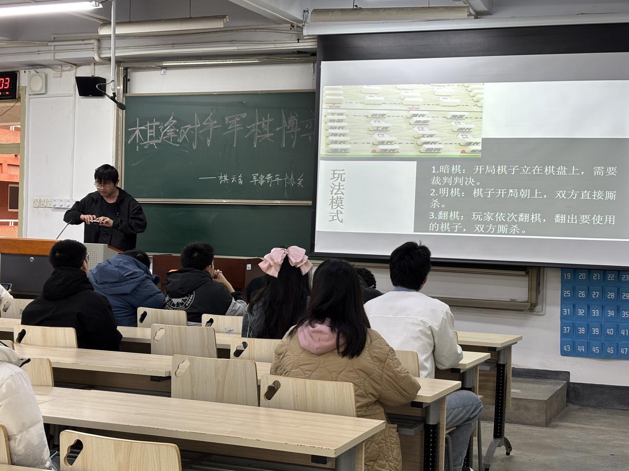 為豐富校園文化生活,培養學生的戰略思維和團隊協作能力,提升學生的講賽踐煉能力,近日,校區社團聯合會軍事青年協會與棋云舍聯合在第四教學樓212教室成功舉辦了“棋逢對手,軍棋博弈”活動。本次活動吸引了30名學生積極參與。