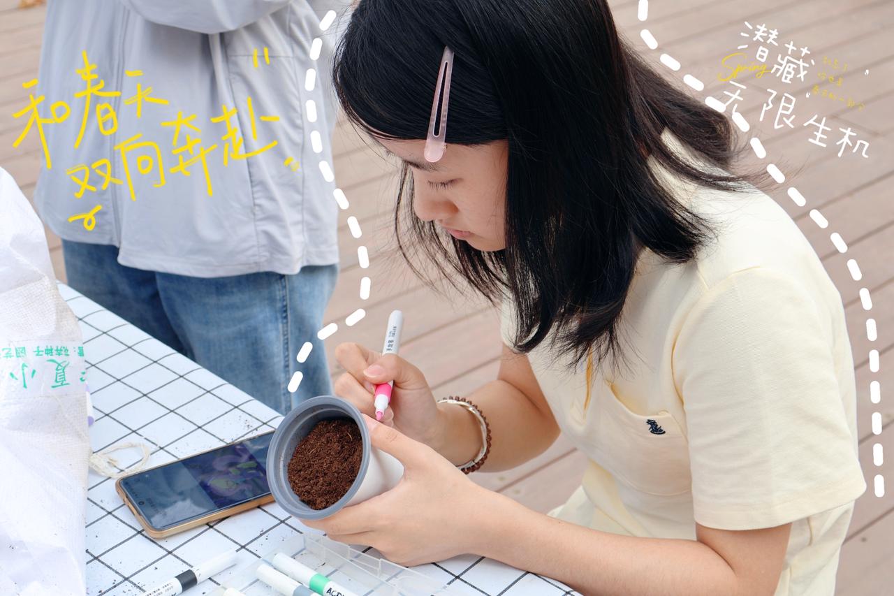 活動現場,同學們有序領取種子盲盒、育苗盤及土壤,并在協會成員指導下學習綠植培育技巧。同學們創意性地通過手繪育苗盆、書寫祝福寄語等形式,將春日創意與溫暖心意融入實踐之中。活動結束后,所有手繪育苗盆、祝福卡片及后續培育成活的綠植將經協會統一贈予鳳凰村留守兒童,讓孩子們共享春日生機與校園溫情。