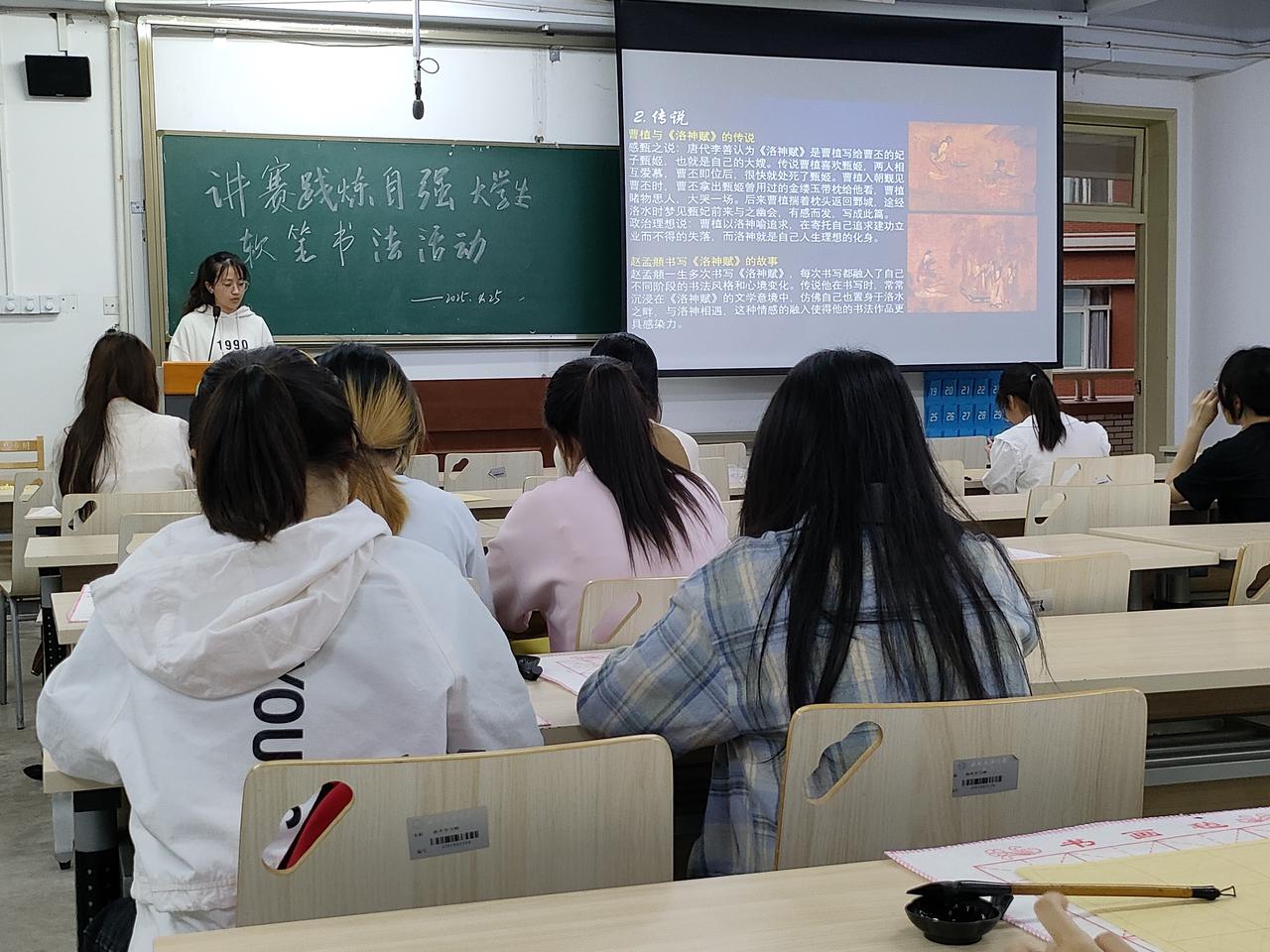 協會書畫理事李竺潔為同學們解析《洛神賦》的文學與書法背景。他講到,在文學上,曹植于黃初三年途經洛水,在政治壓抑中寫下這一名篇;而在書法上,趙孟頫深研“二王”,多次書寫《洛神賦》以展現個人風格。除此之外,他還分享了曹植與洛神的傳說,以及趙孟頫創作時情感投入的軼事,使得課堂氛圍始終輕松和諧。
