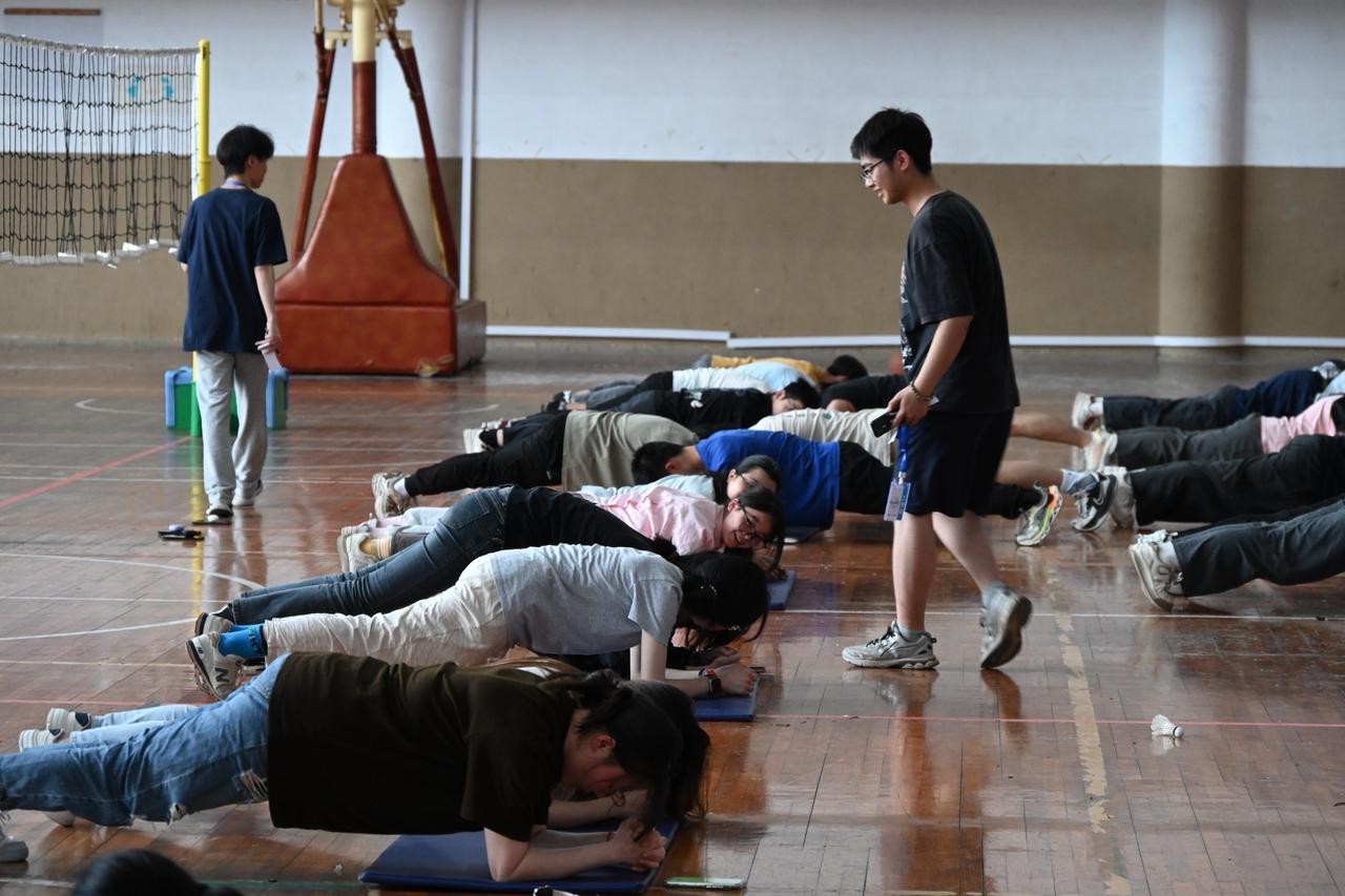 比賽開始前,健身協會指導老師劉軍華帶領參賽者進行系統性熱身,并講解平板支撐的動作要領,將體育教學理論應用于具體體育實踐。平板支撐不僅是對體能的考驗,更是對意志力的鍛煉,這正是體教融合的意義所在。參賽者隨后在規定區域內展開競技,憑借核心力量與堅持精神挑戰自我,場邊觀眾加油聲不斷。