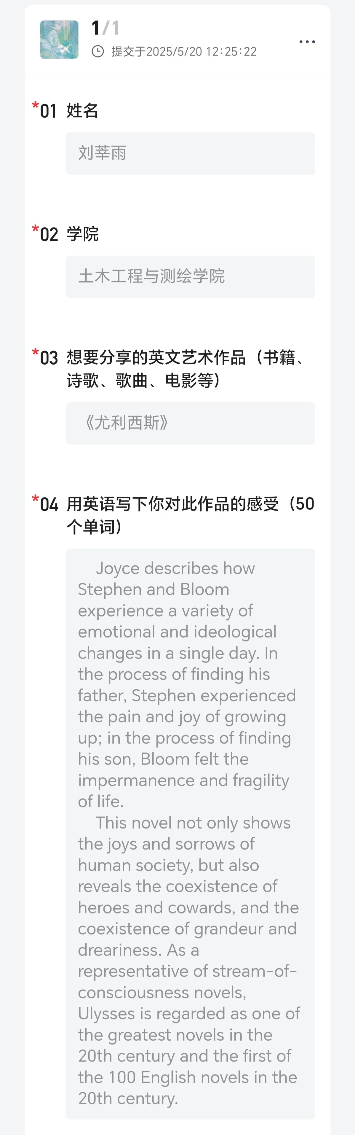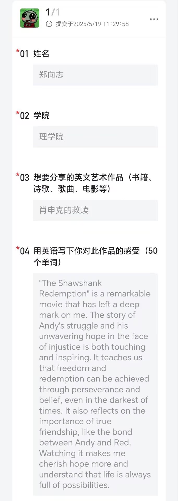 活動要求同學們從角色視角出發,推薦英文書籍、詩歌、歌曲、電影等藝術作品,并提交個人感悟和一篇50詞的英文短評。同學們憑借自己的豐富積累,選出最喜歡的英語作品,寫出自己的感悟,并對作品中的經典語句進行了深度剖析。在英文短評中,既有對《傲慢與偏見》中經典臺詞的剖析,也有對民謠歌曲《Five Hundred Miles》的情感解讀。同學們充滿個性的文字語言,揭示了每個作品背后鮮活的人物與獨特的時代背景。在活動過程中,同學們展現出極強的英語基礎、深厚的文化積累和獨特新穎的思考方式。