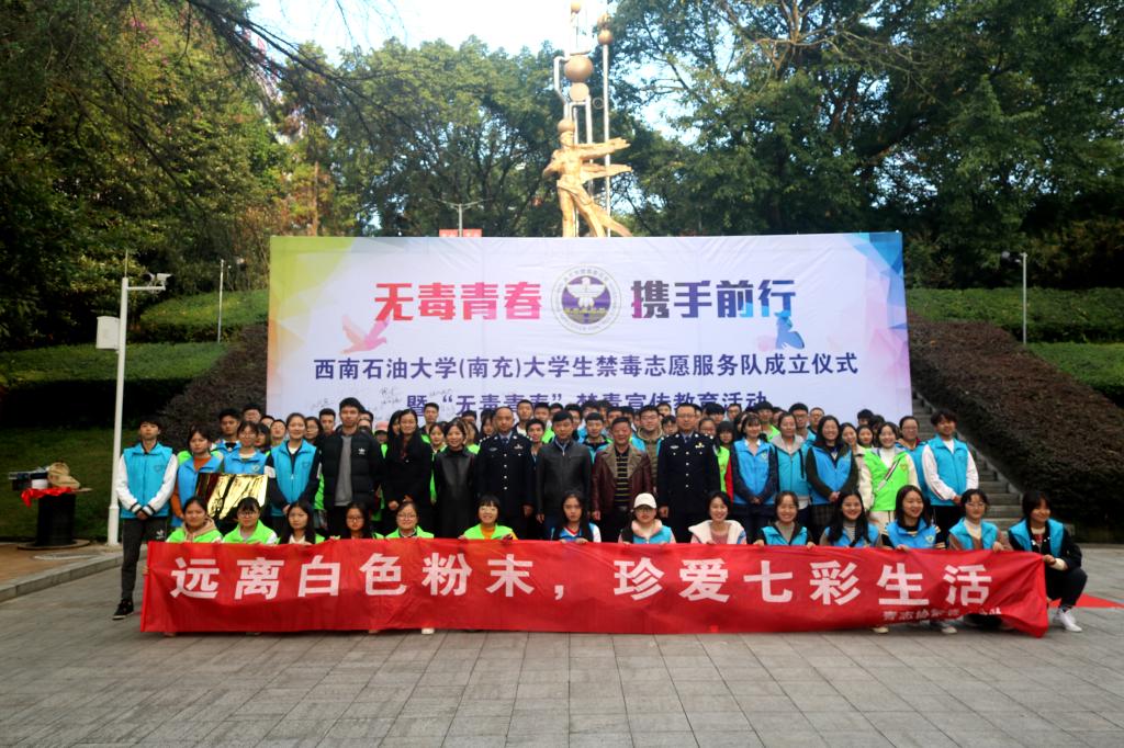 11月8日,南充校區大學生禁毒志愿服務隊正式成立。此次成立儀式由南充校區團委、南充市禁毒委員會辦公室主辦,校區學生會青年志愿者協會承辦。南充校區學生工作部(團委)部長郝江嶺,南充市禁毒辦副主任、南充市公安局禁毒支隊副隊長李永康,預防教育管理大隊隊長王瑾波,校區保衛部治安科副科長蒲和平,校區學生工作部(團委)綜合素質教育辦公室副主任隨明明和近百余名學生代表參加了活動。