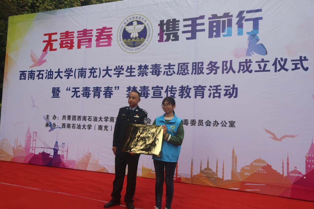 儀式上,郝江嶺詳細介紹了南充校區開展大學生禁毒教育宣傳活動的基本情況。他說,長期以來,南充校區團委以青年志愿者協會為載體,持續開展青少年禁毒防艾宣傳等公益活動,并于2018年暑假成立“無毒青春”暑期社會實踐隊,秉承“服務、奉獻、關愛”的精神,開展了形式多樣、成效顯著的禁毒教育宣傳活動,努力讓禁毒防毒意識深入每個人的心中,為大家的身體健康和社會和諧穩定貢獻了西南石油大學的力量,獲得廣泛好評。郝江嶺表示,南充校區青年志愿者協會禁毒小分隊是校區禁毒教育宣傳工作的主力軍,今天正式成立的南充校區大學生禁毒志愿服務隊將接過禁毒小分隊的接力棒,繼續活躍在校園禁毒教育宣傳一線,組織開展更多的校內外各類禁毒宣傳教育活動,承擔起大學生禁毒教育宣傳的重任。希望同學們,敢于承擔大學生禁毒教育宣傳的使命,堅定“無毒青春”的初心,不辜負校區師生和社會各界人士的期望和信任,引導同學們自覺杜絕毒品的危害。