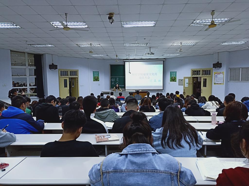 為形成學院的良好宿舍風氣,提升宿舍文化品位,培養學生良好的生活習慣,4月2日,財經學院在4316教室舉行寢室文化月建設動員大會。會議由2016級輔導員曾和麗主持,全體寢室長及生活委員參加本次動員大會。