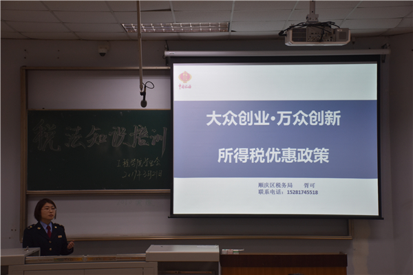 下午2:30,稅務局工作人員應邀于第四教學樓4416教室為志愿者們現場展開了稅法知識培訓講座,順慶區稅務局胥可老師擔任主講老師。