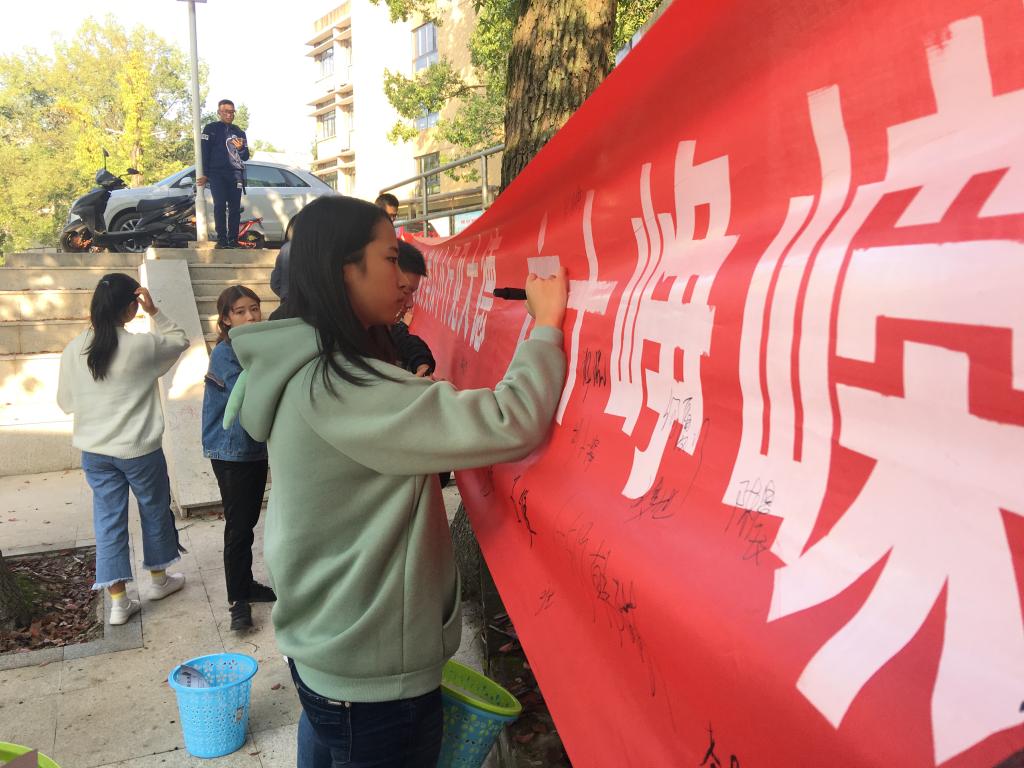 “垃圾分類(lèi)以小行見(jiàn)大德,六十崢嶸度歲月展未來(lái)”。本次活動(dòng)首先組織各室長(zhǎng)及生活委員進(jìn)行橫幅簽名并為各室長(zhǎng)發(fā)放垃圾桶。隨后開(kāi)展了環(huán)保知識(shí)競(jìng)答和“抱團(tuán)”游戲。競(jìng)答過(guò)程中同學(xué)們積極搶答,場(chǎng)面激烈,從眾多同學(xué)中篩選出16名同學(xué)晉級(jí)到“抱團(tuán)”游戲。由游戲產(chǎn)生最后的獲勝者,為其頒發(fā)獎(jiǎng)勵(lì)。