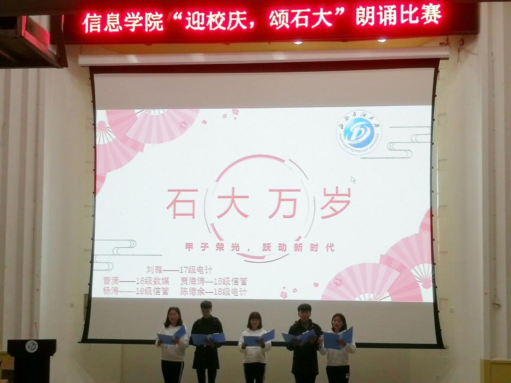 為迎接石大六十華誕,豐富校園活動,10月25日晚,信息學院在第四教學樓4317教室特舉行“迎校慶、頌石大”朗誦比賽決賽。本次活動評委由信息學院學生會主席團和青春飛文學社社長擔任,本次比賽面向信息學院全體同學。